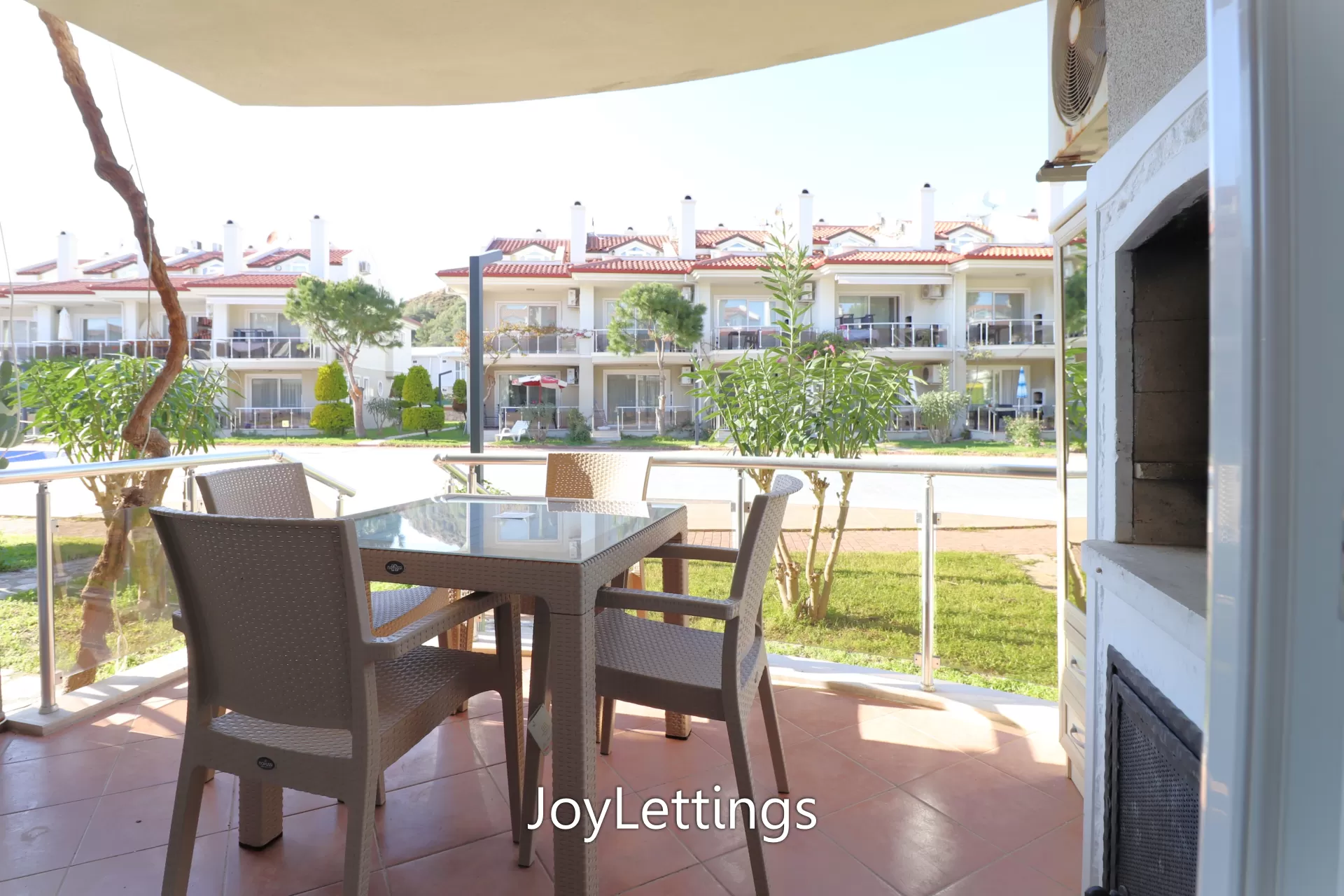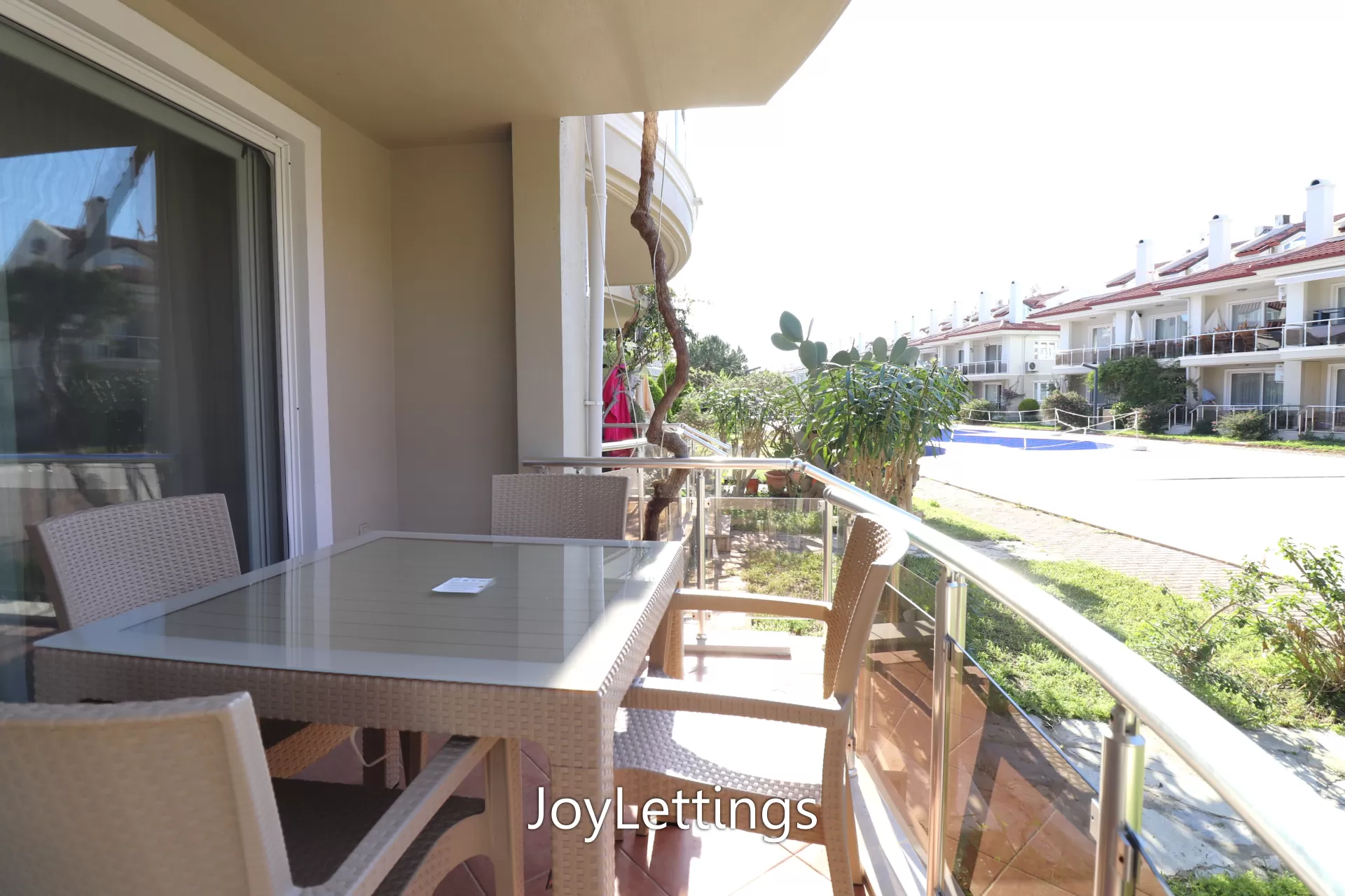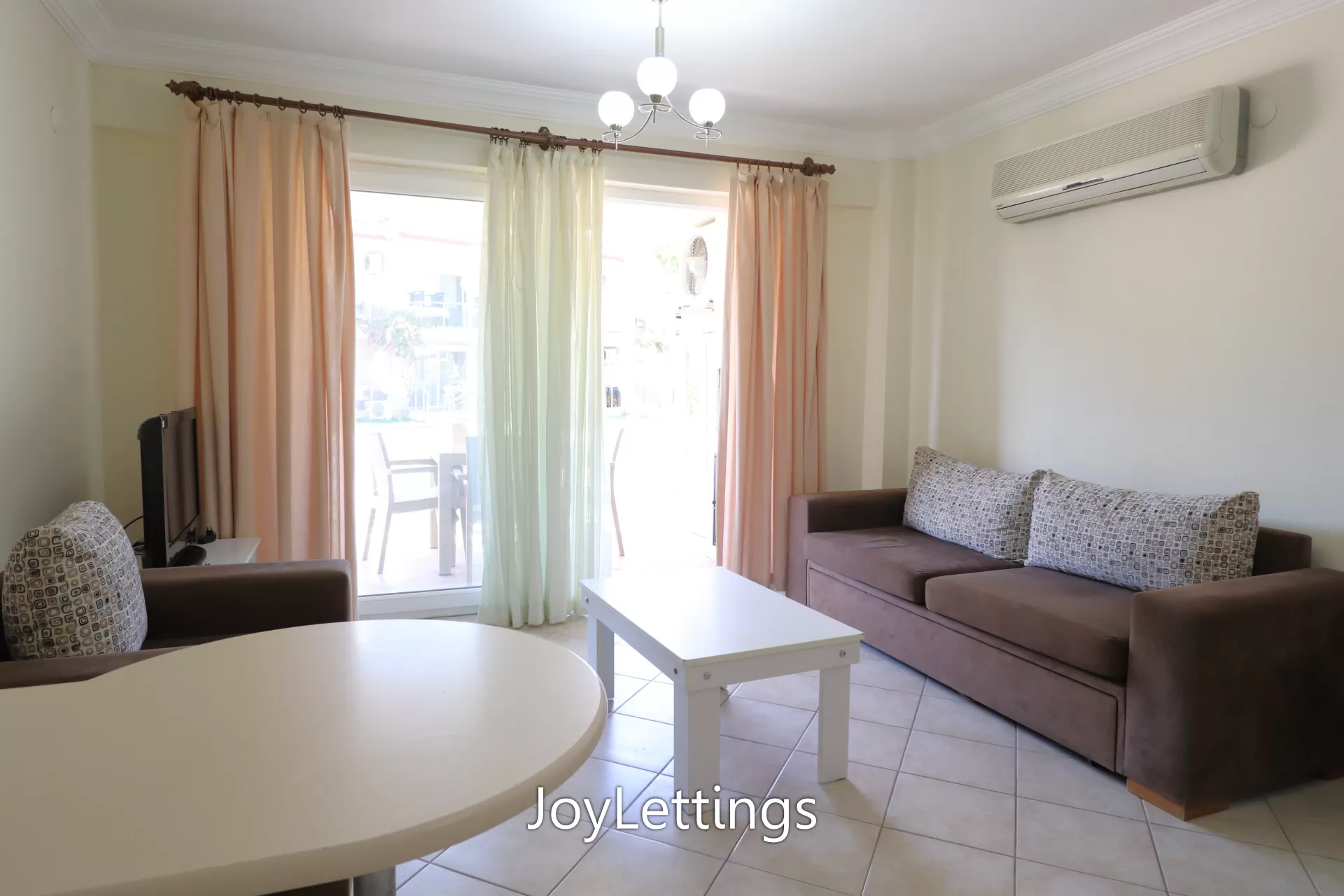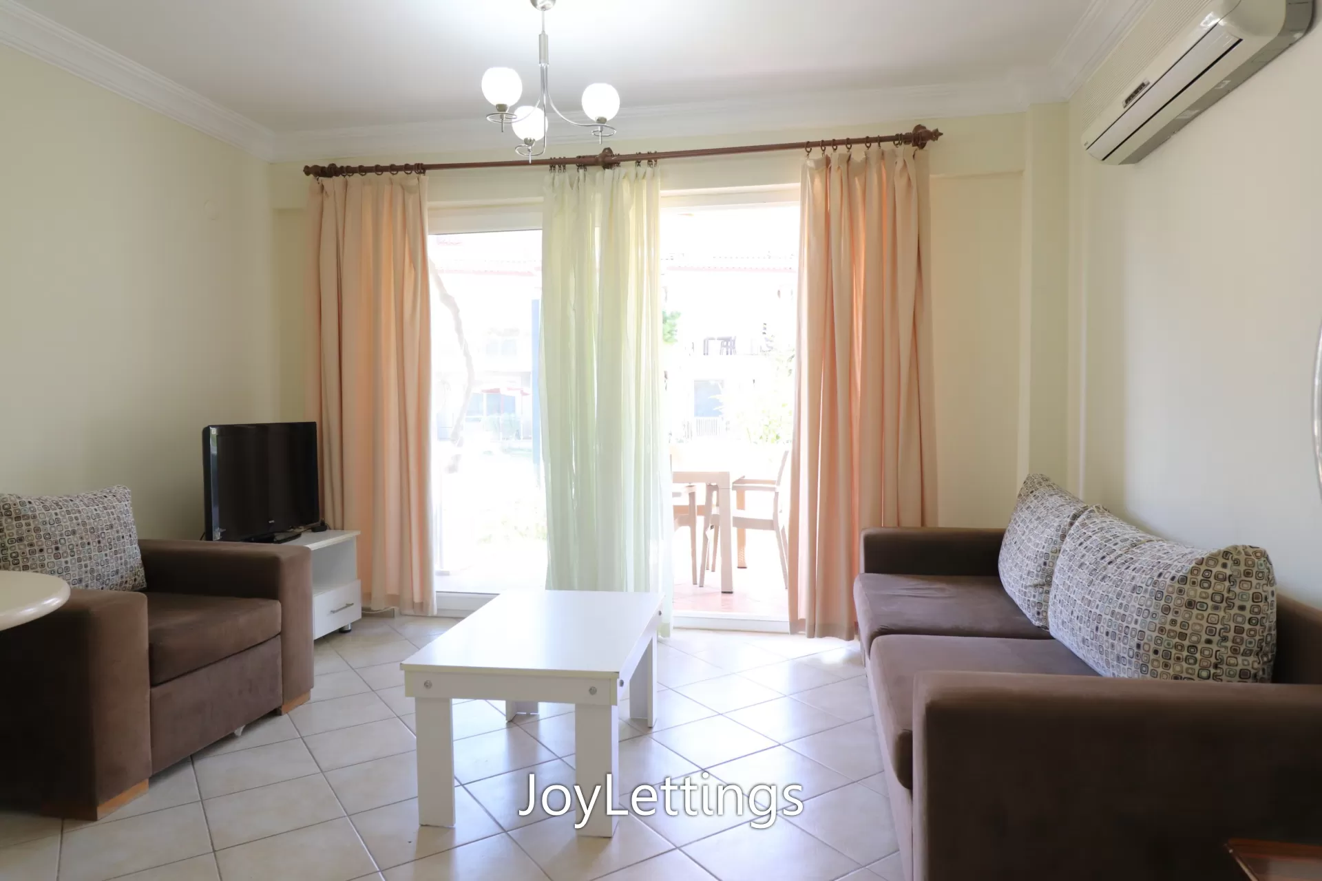 This amazing beachfront complex Sunset Beach Club is in Fethiye, Calis Beach, with a nice private beach. The complex has got a restaurant, bar and supermarket inside. The beach promenade and all central amenities of the Calis town are just at 5-10 minutes walk. This ground floor one-bedroom apartment to rent in Sunset Beach Fethiye, has a good location in the complex, close to the pool. It has got a garden area in front.