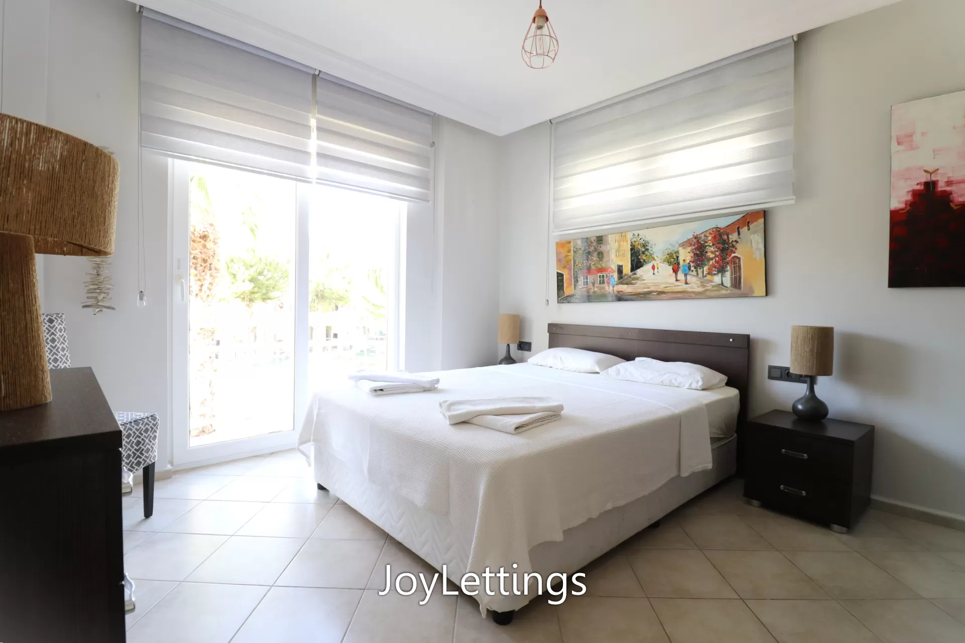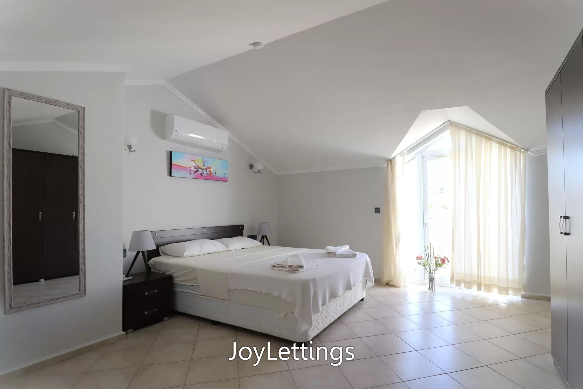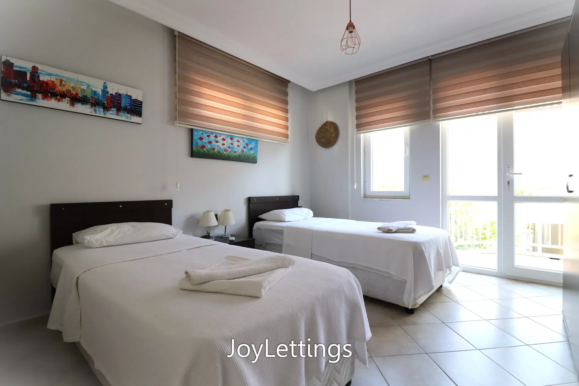 Birinci kat ve çatı katından oluşan, dubleks daire tipindeki bu kiralık yazlığın ilk katında salon, mutfak, 2 yatak odası, banyo ve geniş bir balkon bulunuyor. Bu kattaki iki yatak odasının birinde çift kişilik yatak, diğer yatak odasında ise 2 adet tek kişilik yatak var. Üstteki çatı katında ise içerisinde çift kişilik yatak bulunan ebeveyn banyolu bir yatak odası ve bir çatı terası bulunuyor.
